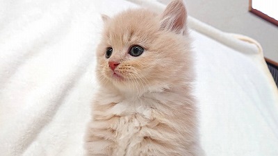 | 特徴 | 食べたくなっちゃうくらい可愛い!ミルクティー風なクリームカラーの子猫です。 ピンクのお鼻がチャームポイント。 ふたりっ子な分お母さんから丁寧に愛情を注がれて元気に成長中です。まだまだ体格・柄・目の色などは変化していく段階ですので確約はできません。ご予約お待ちしております。 | ||