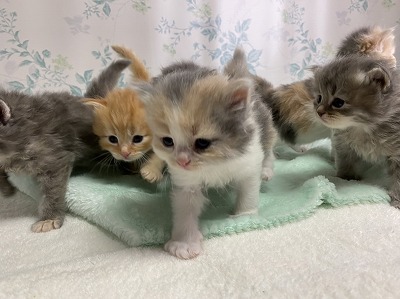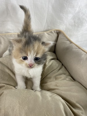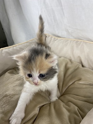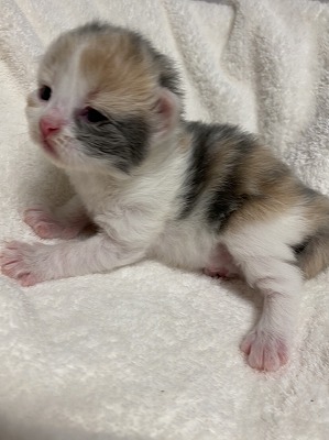 | 特徴 | 6匹兄妹です!バランスのいいダイリュートキャリコの女の子です。お父さんがJCUチャンピオンですので将来の期待大です! ※法令に基づき生後56日経過後のお引き渡しとなります。ご予約お待ちしています。 | ||