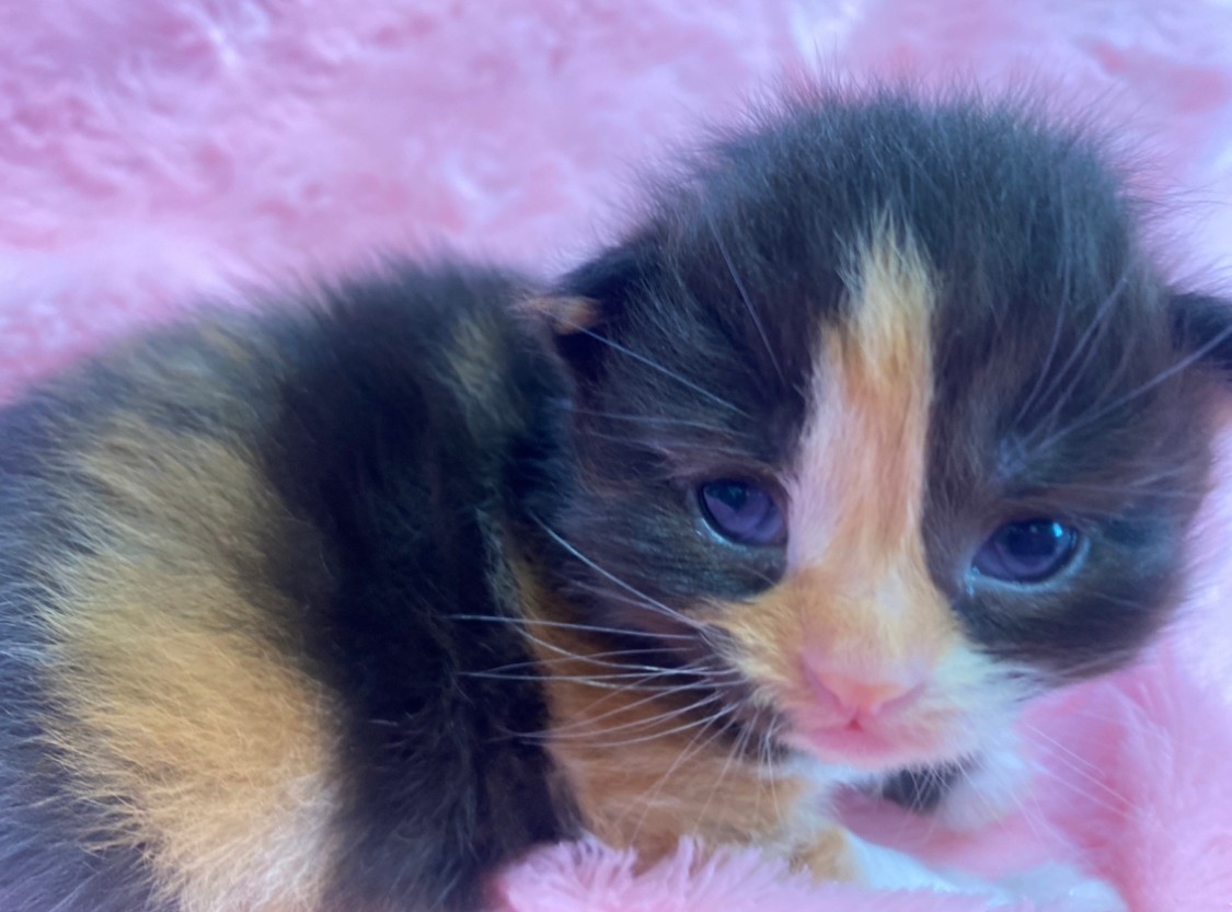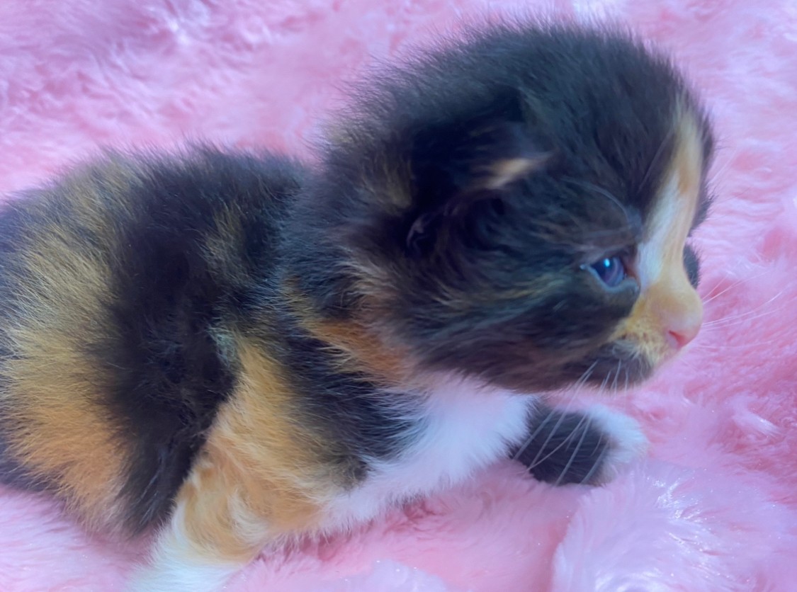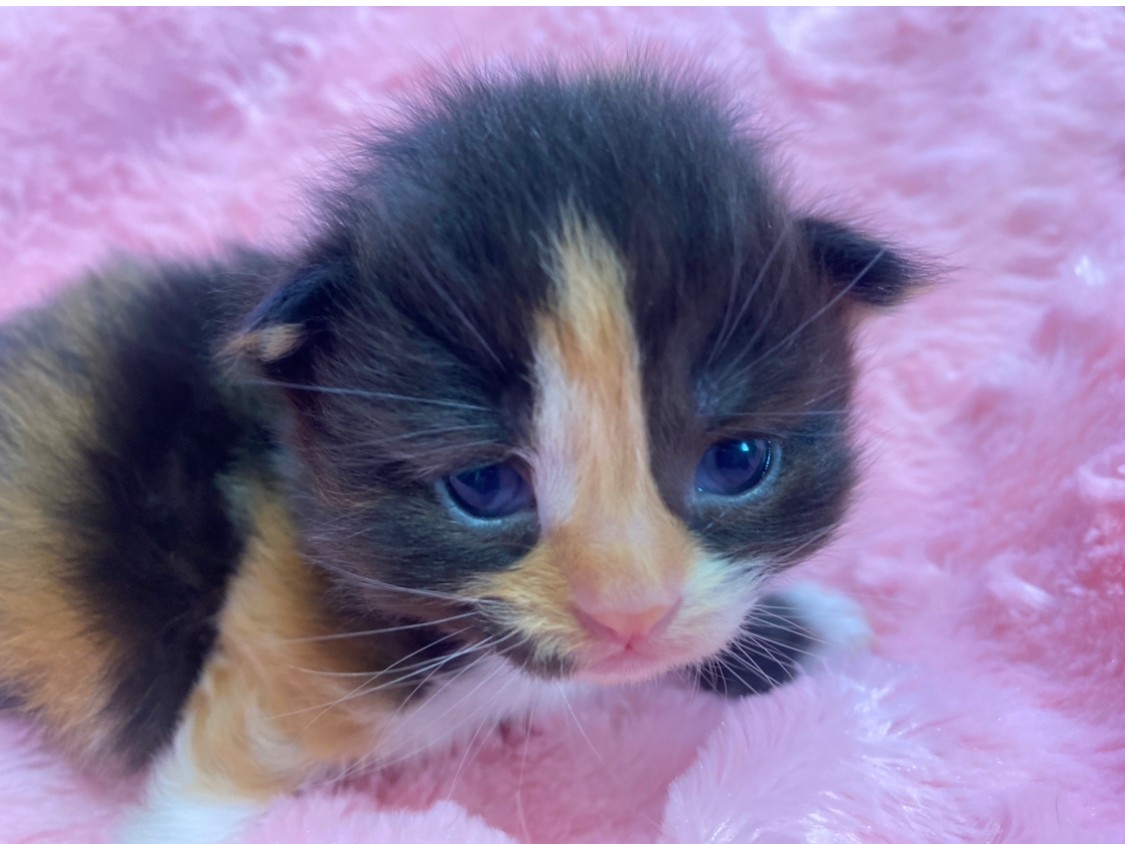特徴 くっきりキャリコ模様がチャーミングな女の子です。パッチワークのような派手柄ちゃんで、家族の人気者になること間違いなし!見学のご予約お待ちしております。