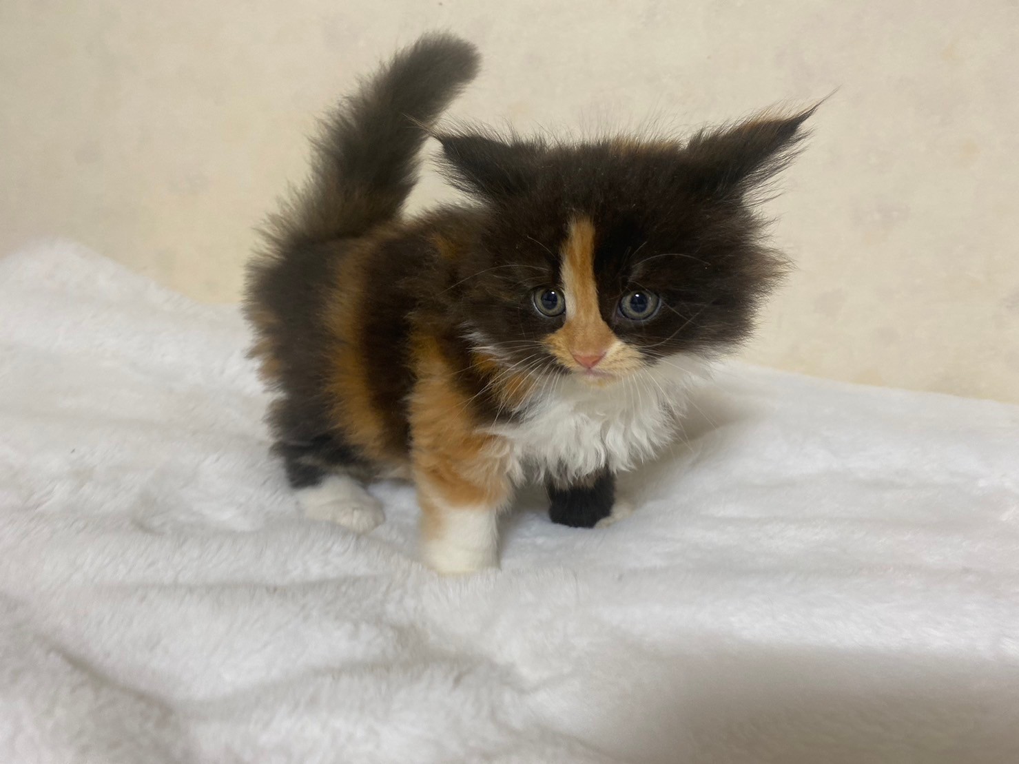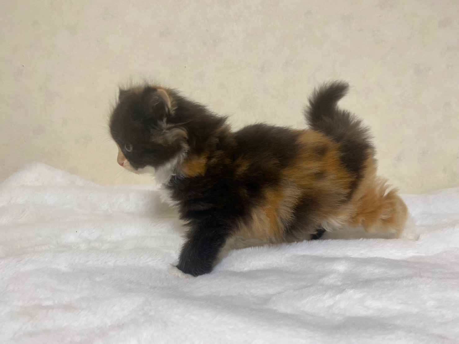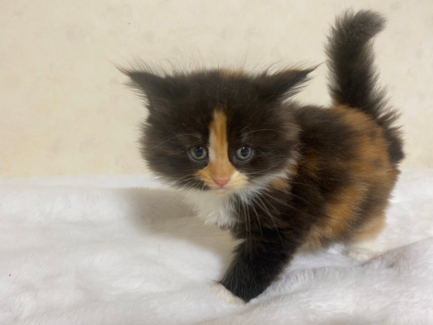 特徴 くっきりキャリコ模様がチャーミングな女の子です。パッチワークのような派手柄ちゃんで、家族の人気者になること間違いなし!見学のご予約お待ちしております。